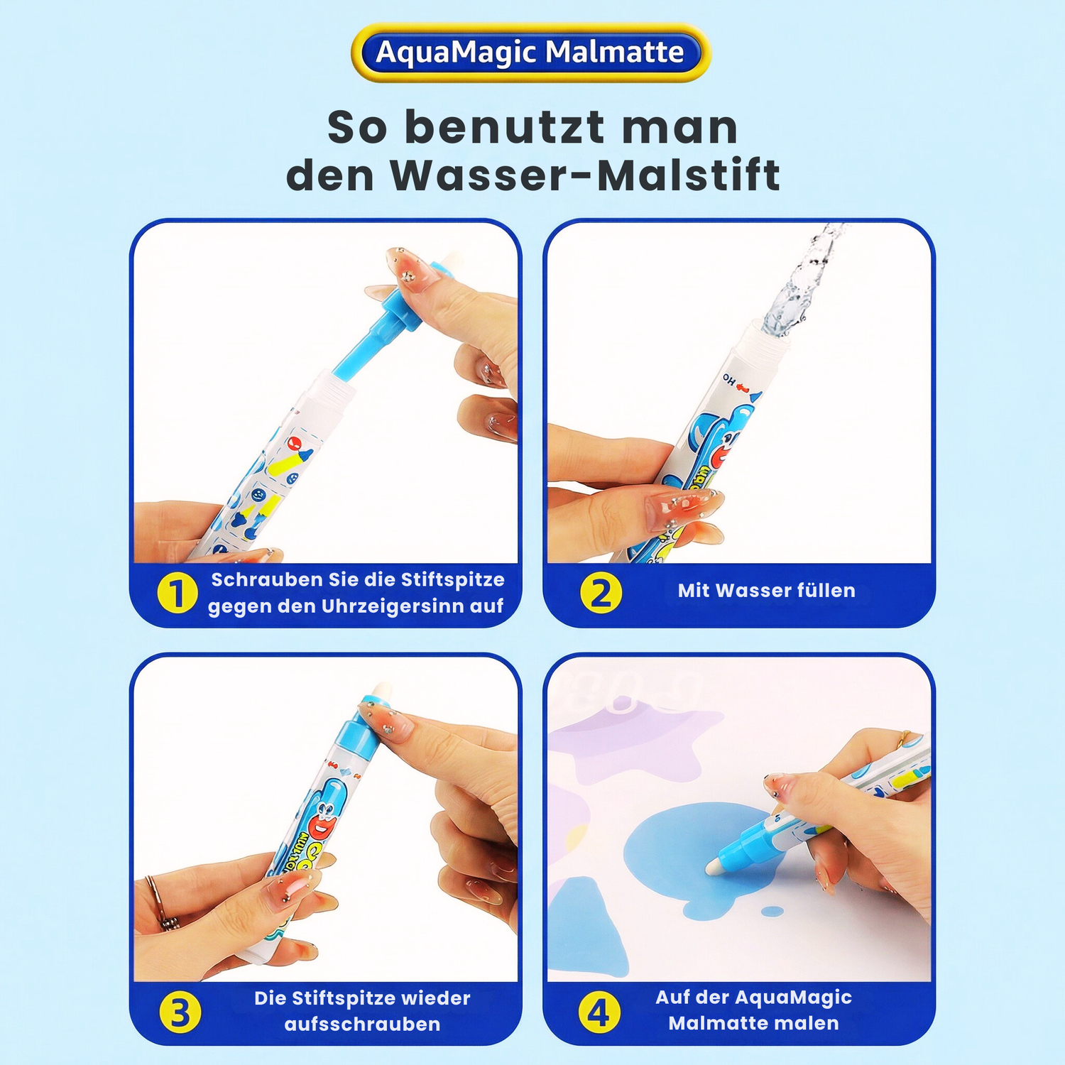 Die AquaMagic Malmatte ermöglicht kreativen Malspaß ganz ohne Farbe oder Tinte. Mit dem mit Wasser gefüllten Stift entstehen wie von Zauberhand bunte Zeichnungen, die nach wenigen Minuten automatisch verschwinden – für endlosen Malspaß ohne Unordnung.